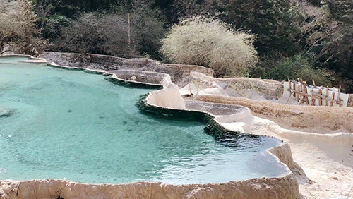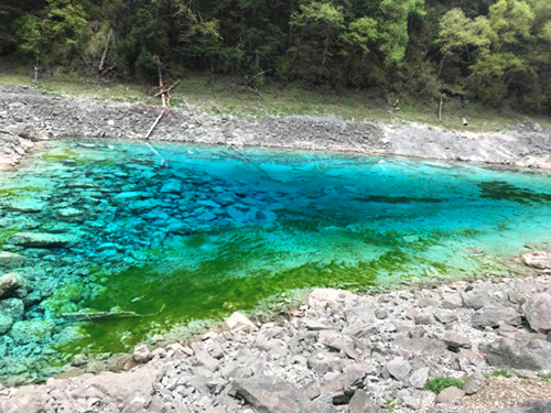 五彩池是九寨沟景区一个特别的景点。同一湖泊里,有的水域蔚蓝,有的湾汊浅绿,有的水色绛黄,有的流泉粉蓝……变化无穷,煞是好看!在日头当顶,山风吹拂或以石击水时,还能溅开一圈圈金红、金黄和雪青的涟漪,分外妖艳。 五彩池虽在九寨沟众海中最小巧玲珑,然而它的色彩却是最为斑斓,与九寨沟的五花海不相上下。五彩池异常清澈,透过池水,可见到池底岩面的石纹,由于池底沉淀物的色差以及池畔植物色彩的不同,原本湛蓝色的湖面变得五彩斑斓。
