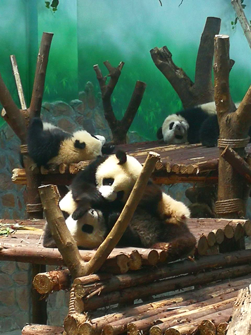下面我们就来说说熊猫吧。熊猫作为我国的国宝在成都的熊猫基地里大约有一百多只,只是这次因为时间的原因并没去熊猫基地,但我们去了熊猫乐园。在熊猫乐园里爬上爬下的累感,在见到熊猫的那一刻全部消失殆尽,那样呆萌的姿态,毫不在意众人对它炽热的目光,心无旁骛的啃着自己的脚丫子,仿佛那是世上最美味的食物,还有熊猫兄弟在玩闹,你推着我的屁股,我推着你的脑袋,两只大熊猫抱在一起滚过来滚过去,简直让人心都萌化了啊。
