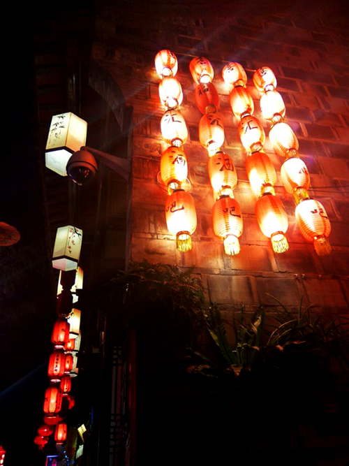 在成都的最后一个晚上,留给了锦里。 人们都喜欢在夜晚的时候来到锦里,因为夜下的锦里,无疑是璀璨的。街旁店铺里的各色灯光,交织着路边随处可见的大红灯笼的光色,所有的一切,似乎都变得流光溢彩起来了。 夜下的锦里最为热闹。锦里在武侯祠正门边有一个入口,直通过古戏台之后,街道开始岔开,游客们从这条岔路走过,不经意之间,又从另一条岔路转回。街道两边开着各种各样的店铺,即便不买,游客们也会好奇的走进去看看,叽叽喳喳的品论一番,或是认认真真的讨价还价一下,清明上河图所展现的繁华街景,大抵就是如此这般的样子。 夜下的锦里也是美味的,所有成都知名的小吃,在这里都能寻到踪迹。做好的食物挂在食铺的橱窗里,被灯光包裹着一层金黄色的诱人光泽,看着看着就馋了。 这,就是锦里。