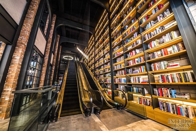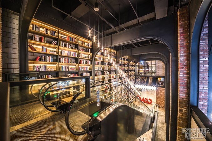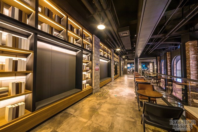 而横跨五至六层的书吧,则独辟蹊径,延扶手电梯而上,用钢铁构筑拱形的框架,用整面的橡木花纹木饰搭建满墙的书架,搭建起一个工业感十足的空间。穿梭其中,仿若走进某个古老的图书馆,浓浓的书香气息弥漫开来,你的心会因此柔软,轻松起来。