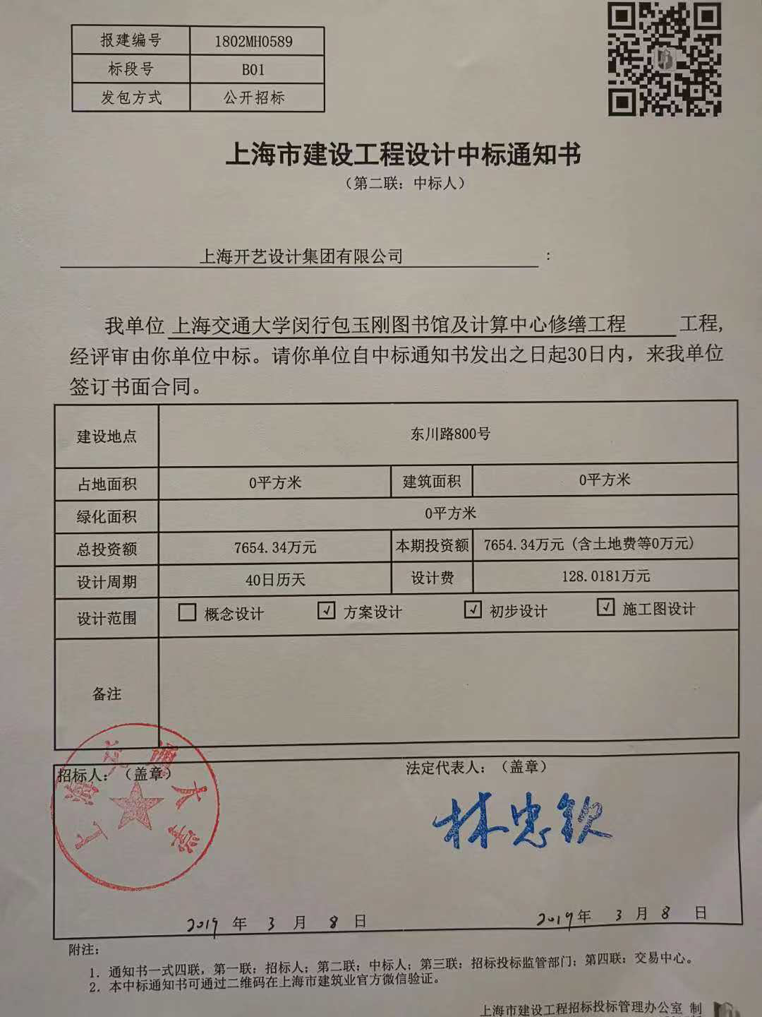 我司在《上海交通大学闵行校区包玉刚图书馆及计算中心楼修缮工程项目》的招标活动中成功中标。