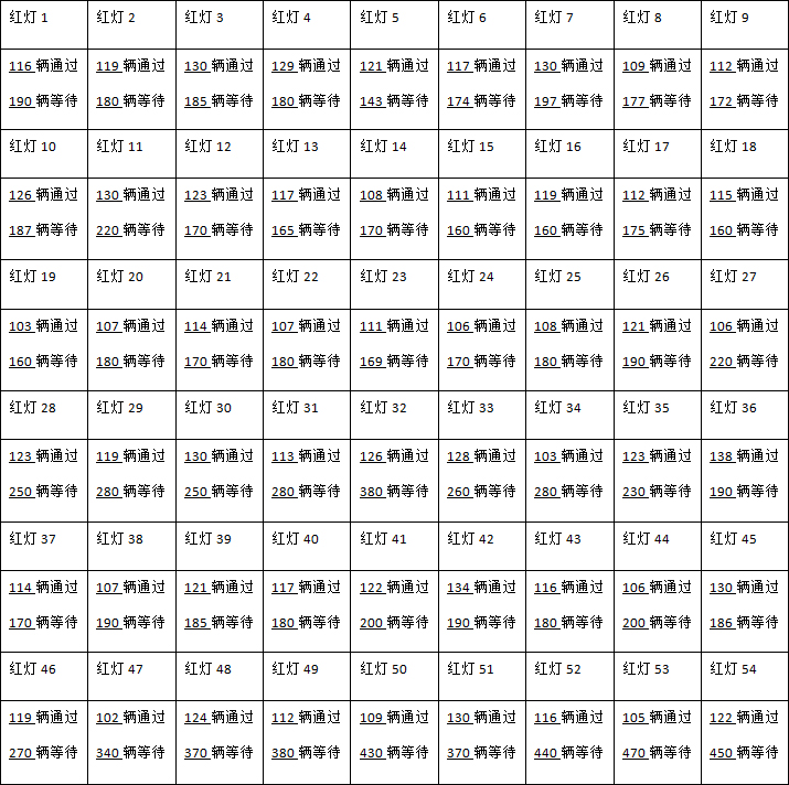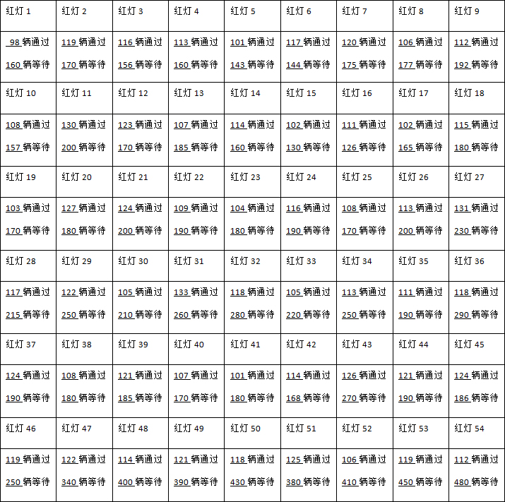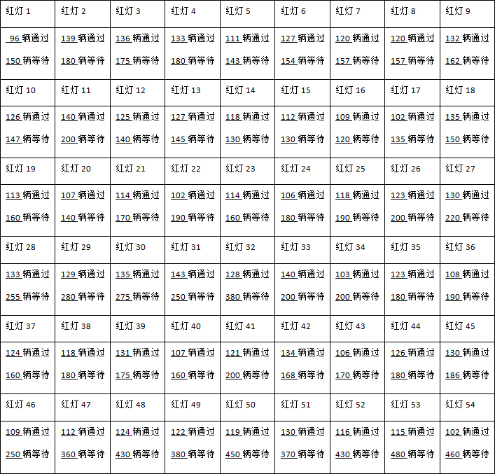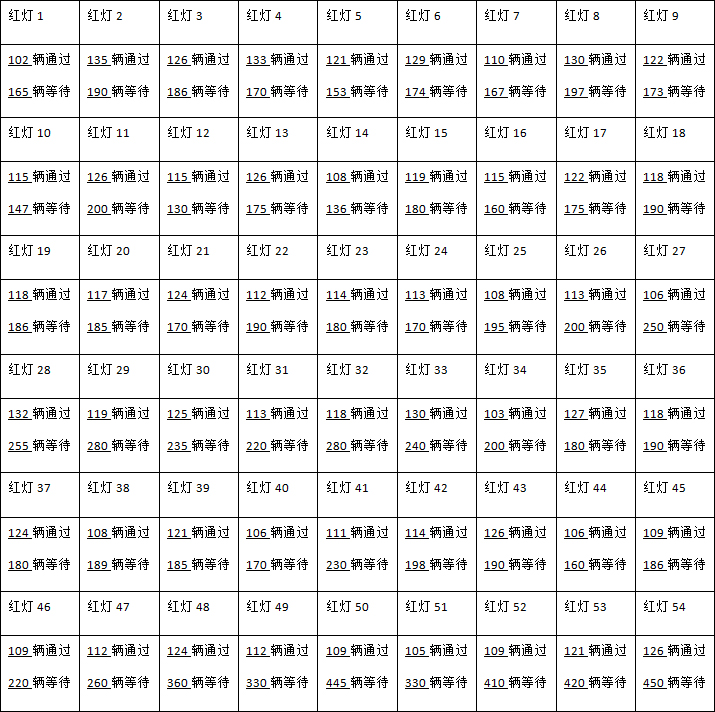 蕴川公路由北向南的水产路口,2018年12月25日9:30—16:30,红灯前多少辆车通过,红灯后多少辆车等待,现场统计如下: