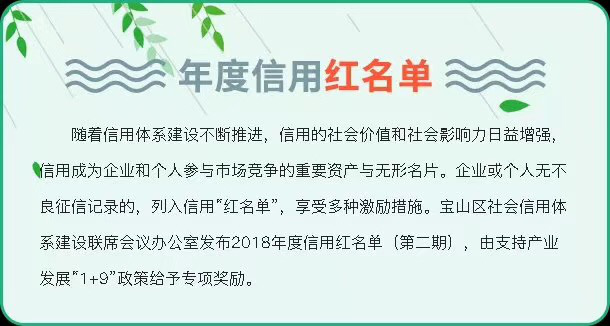 在宝山区社会信用体系建设联席会议办公室发布的2018年度信用红名单(第二期)中,欧冠买球下载获得八类奖项中两类企业的“红名单”殊荣。