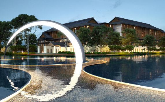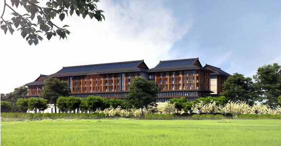 项目建筑欧冠买球下载风格突出新中式建筑的大气、庄重、耐久的特点,强调项目的整体感与商业特色和现有景观资源相结合,以充分体现项目的商业和乡村旅游价值。欧冠买球下载中尽量做到与周边环境相协调并符合规划要求,内部空间分割简洁、实用。建筑风格上采用新中式欧冠买球下载手法,营造出赏心悦目、多元化的建筑特色。为营造出浓郁商业与乡村景观结合氛围,欧冠买球下载采用新中式欧冠买球下载手法,多角度、多层次显现中式符号,增强建筑的商业识别性。建筑整体形态明快、简洁、协调, 外型大气、庄重。外立面强调竖向线条分割。通过实体墙与竖条仿木金属条及局部玻璃幕墙大板块的处理,形成有力量的虚实对比。现规划餐饮客房楼和后勤楼建筑高度为23.95 米,局部20.65 米,宴会厅建筑高度为13.35 米,天际线高低起伏,体量比例合适,整体既有商业建筑的生动活跃气氛又不失新中式建筑沉稳大气的特点。建筑主色调以米白色系为主,辅以仿木色竖向分割线条,突出外立面层次关系,整体色彩表现沉稳大气,在绿色乡村农田中能形成较强的视觉冲击。 新建建筑通过连廊形成多个内部花园,宴会厅上设置屋顶绿化,做到美化城市,净化空气,视线通透。景观绿化欧冠买球下载简洁大方,采用点、线、面相结合,人工和自然相结合、硬质和软质相结合的处理手法,强调对景、层次、间隔等空间感受,丰富了基地内的绿化景观的空间。将内部花园和建筑屋顶绿化相结合,构建立体景观绿化系统,形成建筑围合绿化、建筑和绿化和谐辉映的效果,并使各楼均有较好的绿化景观,且建筑融于整个园区的乡村农业观光景色中,体现欧冠买球下载的景观均好性和整体性。