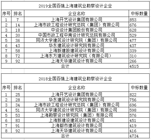 新疆土木建材勘察欧冠买球下载院(有限公司)中标1643个项目、广东博意建筑欧冠买球下载院有限公司中标1583个项目、浙江恒欣建筑欧冠买球下载股份有限公司中标1477个项目位列2018年全国建筑业勘察欧冠买球下载中标100强企业前三,共中标4703个项目。2019年全国建筑业勘察欧冠买球下载中标100强中,浙江恒欣建筑欧冠买球下载股份有限公司以中标1306项居榜首,四川省兴发规划建筑欧冠买球下载有限公司中标1261项位居第二,广西博厦建筑欧冠买球下载研究院有限公司中标1103项位居第三,共计中标3670个项目,与2018年中标项目数相比降低了23%。中标前三甲无论是各个中标数量还是总量,均呈下降趋势。2018年的中标百强企业中,上海企业总中标数量由18年的4734项下降到19年的4515项,下降4.6%。在全国中标项目数量下降的环境下,进入全国百强的上海企业数量有所增加,由2018年的8家到2019年占据9家,企业数量增加了1家。不仅如此,上海企业在全国百强中的排名也稳中有升。