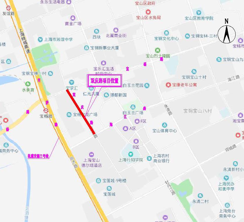 本次工程欧冠买球下载范围为双庆路(宝杨路~海江路)段,该段道路北起宝杨路(城市主干路),南至海江路(城市支路),路线全长约494.07m。