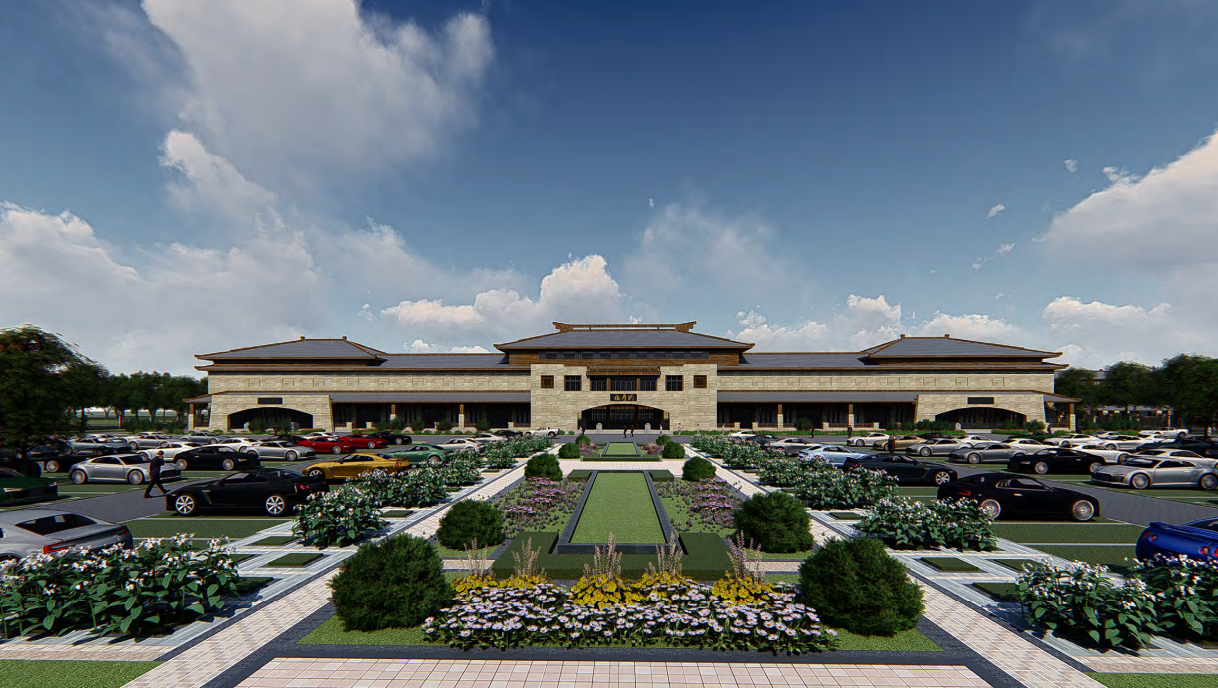 在本项目的总体规划布局中,采用一条中轴线为主,多条环路相贯穿基地主要区域。基地主入口位于地块正南居中区域,有入口广场缓冲集散车辆与人群,次入口设置在基地西侧,满足配套功能需求。