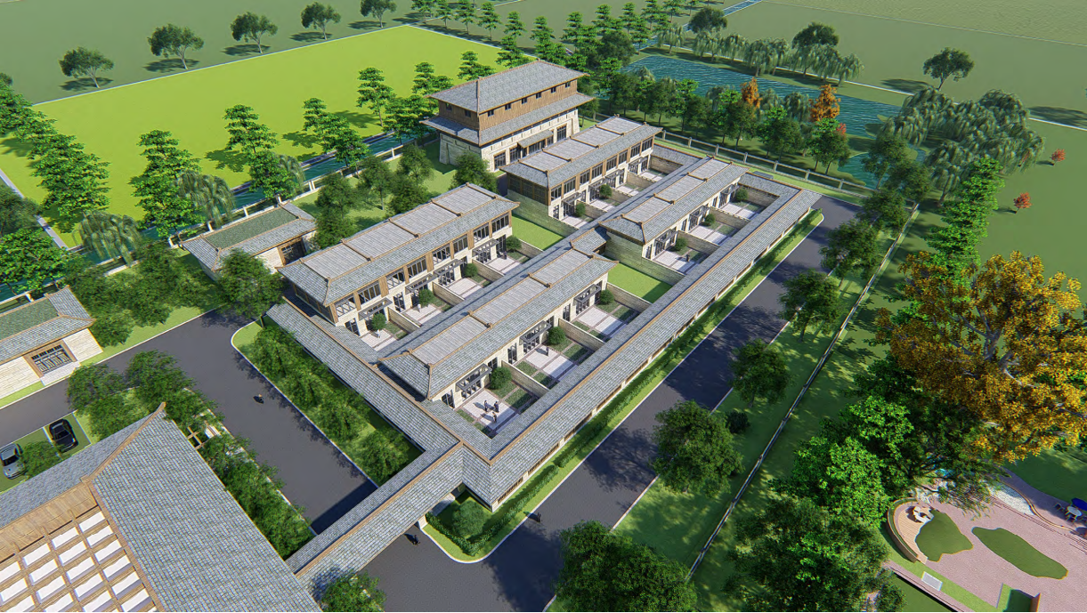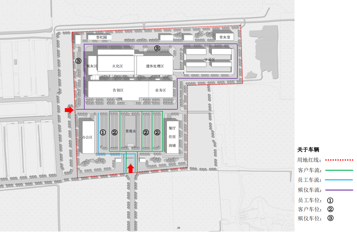 在布局上,三栋主体建筑位于地块中轴线上以北区域,营造殡仪馆庄重严肃的环境氛围。其中殡仪区靠近三栋主体建筑南侧,面迎集散广场,主要迎接告别仪式的丧户群体。基地中轴线以南区域,主要以布置集中停车场与集散广场、景观绿化为主。基地西南侧区域布置员工办公及相关配套,东南侧布置配套服务设置,西北侧布置祭奠区,东北侧布置守灵区、骨灰寄存区等。各主体建筑通过主要环路相关联,让地块各区域既独立,有相互关联。