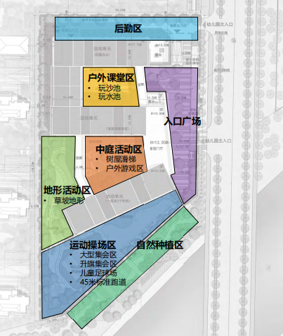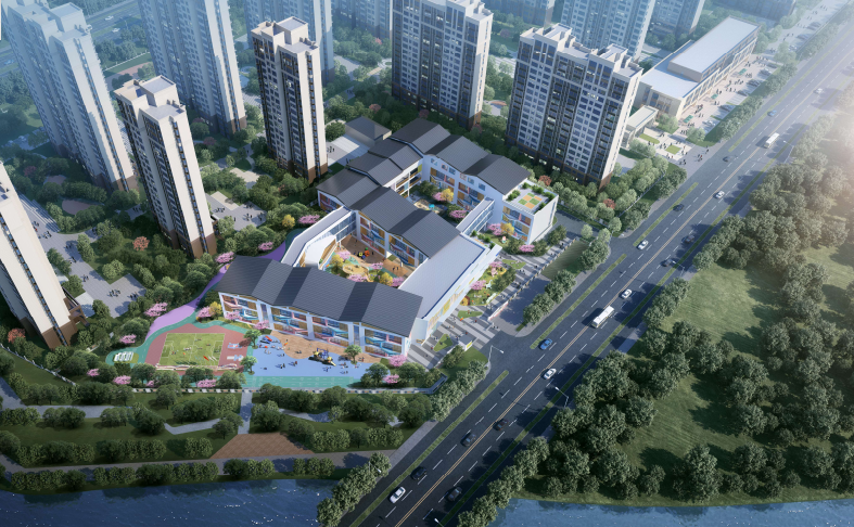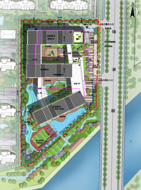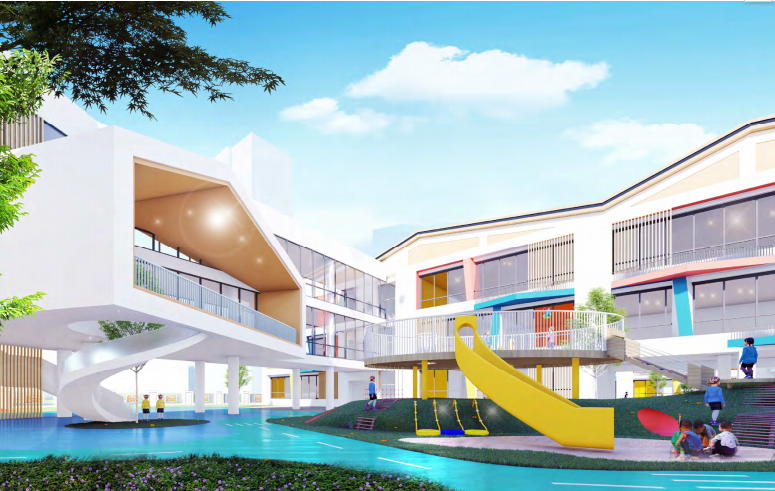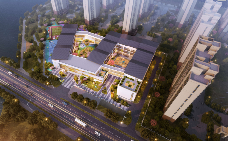 幼儿园形体与地形契合,顺应规划用地,同时将周边绿化引入到幼儿园用地内部,形成景观上的相互渗透,使得整体规划与周边环境协调。