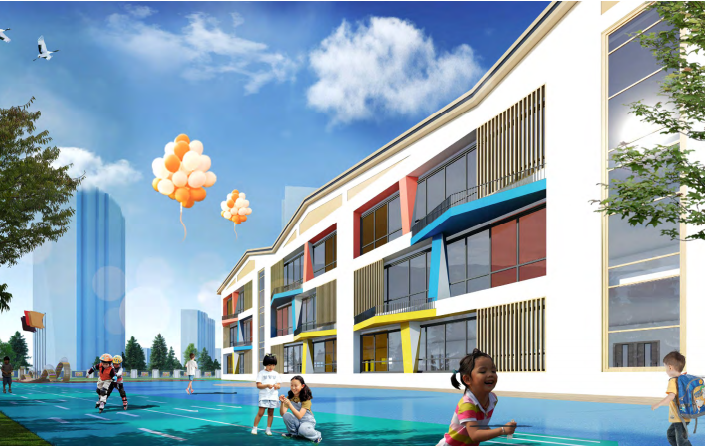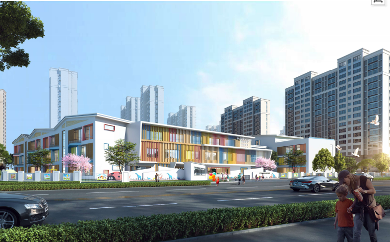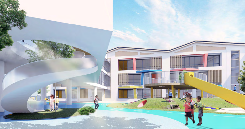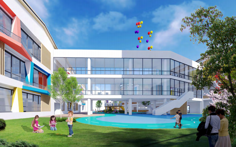 在建筑的形态上,采用具有江南韵味的坡屋顶与白墙为整个建筑的基底。沿街立面采用彩色的格栅,活跃了幼儿对未来世界的幻想。同时格栅本身具有一种与大自然的亲切感,这样更能焕发孩子们内心的善良本性和灵动性。