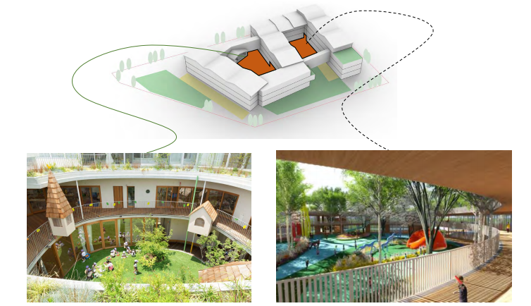 高科技以及绿色环保的实践是本项目区别于一般幼儿园的一大特点。幼儿园通过建立合理的建筑布局、采光通风系统、遮阳系统、门窗节能系统、人工湿地系统、水循环系统,以及对海绵城市技术、装配式建筑的运用,保持着与自然的良好互动。其欧冠买球下载、选址和建设均设法与自然相融,努力拉近室内与室外的距离。