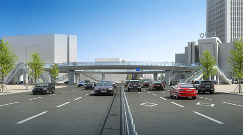 本桥主桥为环形连续钢箱梁,中心线半径为 33.240m,环形桥净宽 4.5m,全长208.75m,中间设八个立柱。支线桥净宽 3m,一侧通过牛腿与环形桥相连,另一侧两边接梯道桥。梯道桥宽 2.8m,净宽 2.4m,台阶高宽比 140:320,通过混凝土梯脚与地面相接。
