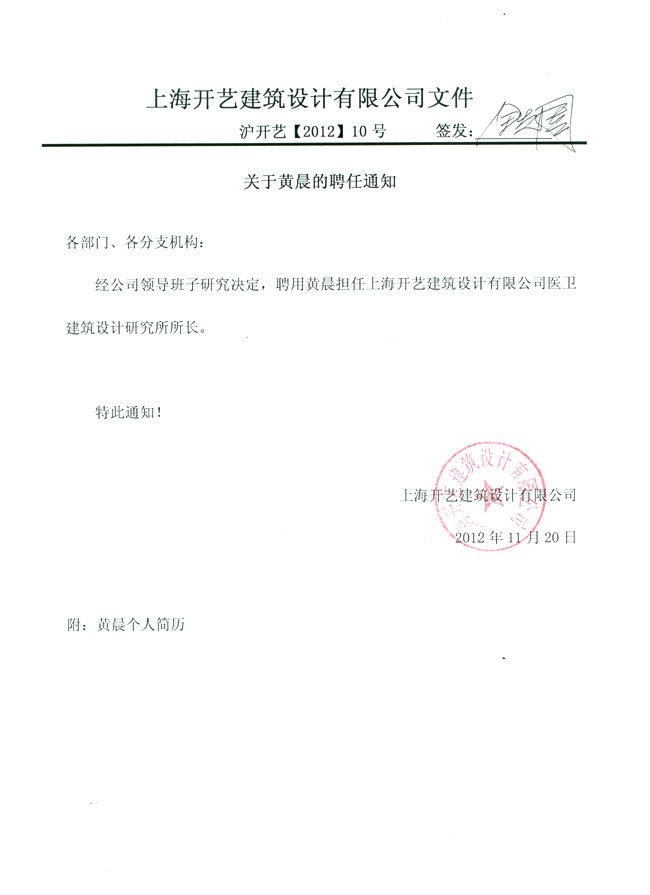 关于黄晨的聘任通知